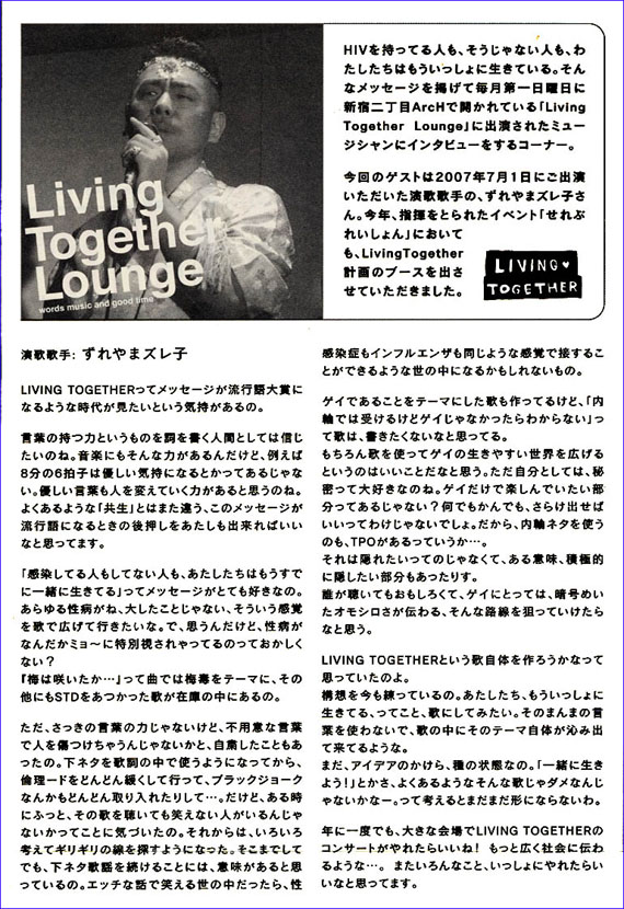 下ネタの歌を作ってパフォーマンスする大義名分を語ってみました。性的な病気が、ちょっと恥ずかしいけど侮蔑される事が無くなるように、性的な話題を面白おかしく話せる環境があってもいいと思うんです。インフルエンザもHIVも、何処にでもある不通の感覚で話せたら、きっと「Living Together」の持つ言葉のパワーが、もっと広がるんじゃないか?って思ってます。