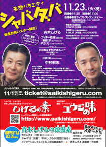 斉木しげるさんプロデュースのイベントに日出郎&ずれやまズレ子がゲスト出演することが決まりました。詳細は、追って報告します! ◆斉木しげる&中村有志の妄想バラエティー「シャバダバ」 ◇日時:2010年11月23日(火/祝)/開場16:30/開演17:00〜 ◇会場:新宿 ライブレストラン ダイトー http://www.lrd.jp/ ◇出演:斉木しげる、ブッチー武者 (懺悔の神様)、東郷 淳 (モノマネタレント)、平方 元 (シンガーソングライター)。川奈 栞 (グラビアアイドル)、中村有志 ◇ゲスト:日出郎&ずれやまズレ子(おネエ歌謡ユニット) ◇チケット: ・ 指定席(正面席保証)6,000円+別途1ドリンク500円 ・ 自由席(サイド席)4,500円+別途1ドリンク500円 ◇打ち上げ:当日同会場で20:00〜打ち上げあり。チケット購入時に同時予約(4,000円)…先着50名様 ◇新宿クレイジーナイト公式サイト http://s-cn.tk/ ◇斉木しげる公式サイト[しげるの素] http://www.saikishigeru.com/ |