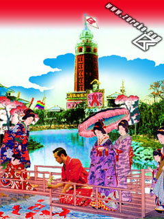 本ウェブサイトの扉絵にもなっている、明治開化絵と実写をコラージュした画像を、期間限定で公開いたします。この画像をダウンロードして、PCから7メール等で、自分の携帯に送信すれば、待ち受け画面としてお使いいただけます。